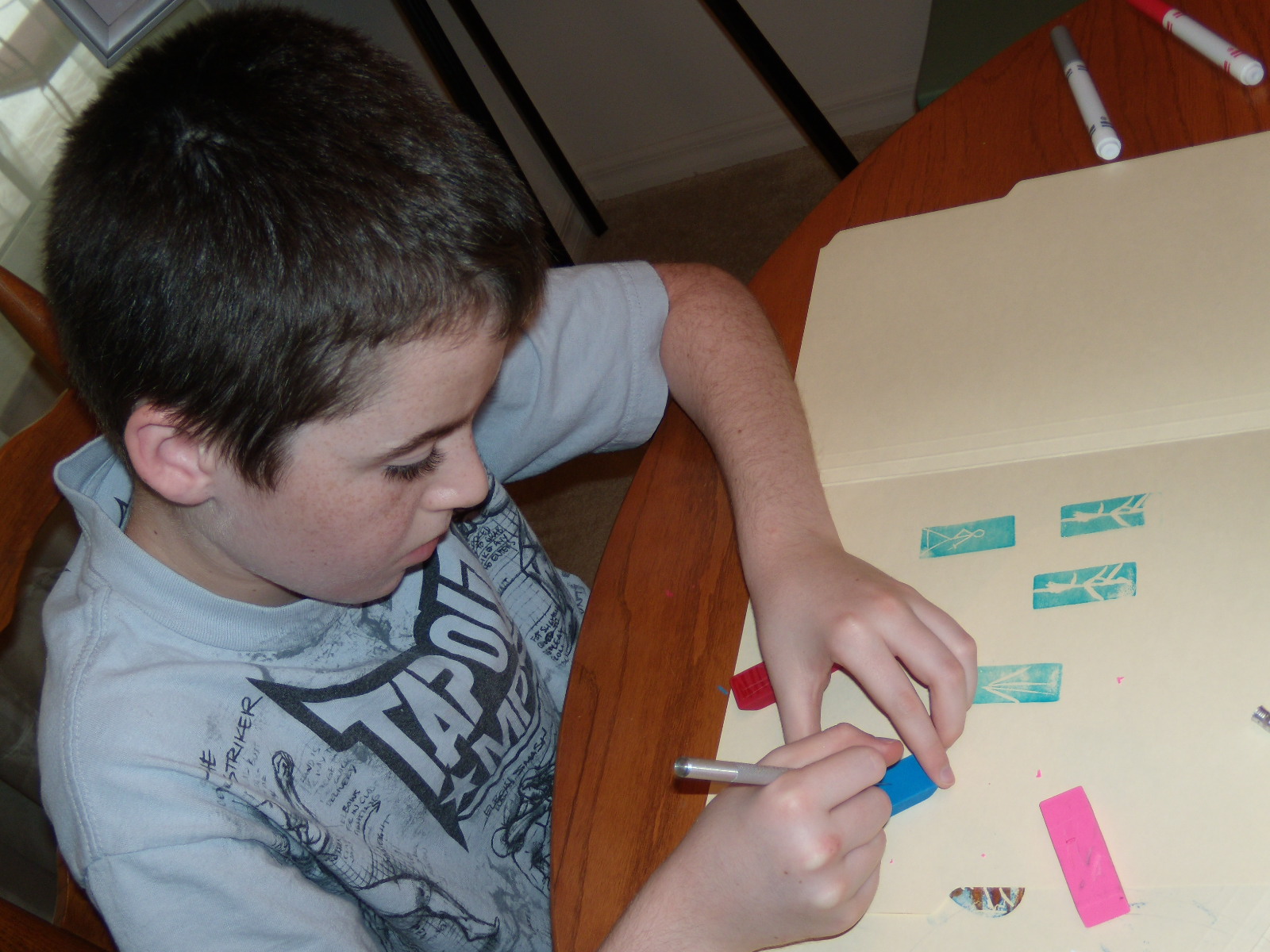 We are carving erasers into rubber stamps, and then stamping all over the place!